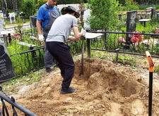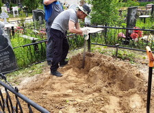 На этом участке мы работали с могилой, на которой сравнительно недавно произошло дозахоронение – земляной холм даже не успел как следует осесть и разойтись. На территории участка уже находился гранитный памятник специфической формы, копию которого нам и предстояло установить.
