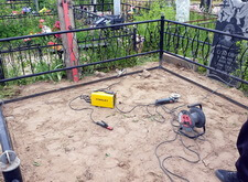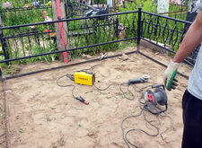 Первым делом мы подготовили участок к работам: демонтировали уже установленное надгробье, а также разровняли почву на могиле, тем самым подготовив её к укладке наземного покрытия.