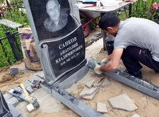 Памятник аккуратнейшим образом крепим на подставку, к которой пристраиваем цветник. Ту же операцию повторяем и со вторым надгробьем. Памятники выставляем строго на одной линии, параллель, а также горизонталь цветников проверяем с помощью уровня. Чёткая установка исключает не только наличие визуальных дефектов, но и имеет практическое значение: поставленный «как надо» памятник в дальнейшем не завалится на бок, а благодаря обкладке брусчаткой и не просядет вниз.