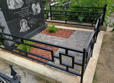Через некоторое время возвращаемся к могиле. На территорию участка выкладываем брусчатку, оставляя два прямоугольных цветника, в которые сажаем небольшие можжевеловые кусты. В результате получилось качественное наземное покрытие с дорожкой до надгробья. Клиент осталась довольна нами и оставила видеоотзыв.