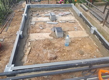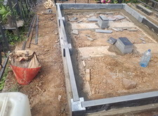 Укрываем внутреннюю зону участка геотекстилем и приносим три массивные прямоугольные плиты, которые в дальнейшем послужат наземным покрытием могилы.