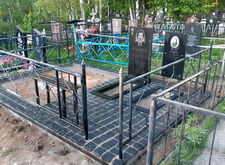 Уложив периметр, мы застелили территорию места захоронения геотекстилем, и выложили брусчатку вокруг памятников, предварительно установив лавочку со столиком.