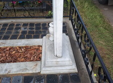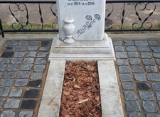 Внутрь бетонного цоколя кладём брусчатку, красим оградку, наполняем цветник корой, надписи на памятнике покрываем чёрным акрилом. Обычно мы кладём наземное покрытие так, чтобы бетонного цоколя не было видно, однако, в данном случае клиент не пожелал переустанавливать ограждение и проводить какие-либо дополнительные работы, так что брусчатка была уложена вовнутрь. Состояние места захоронения после проведения работ представлено на нижеприведённых фото.